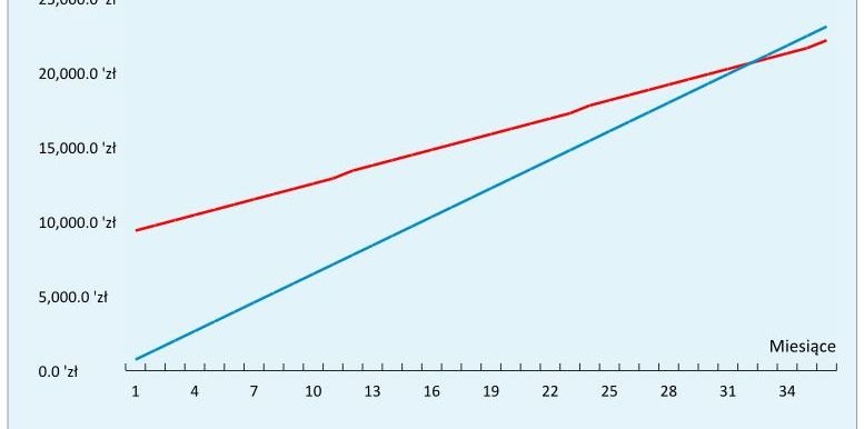 Poniższy wykres prezentuje porównanie całkowitego kosztu posiadania (TCO) Subiekta GT w obu wariantach, gdzie do kosztów modelu zakupowego z tabeli dodano uśrednioną kwotę 350 zł mies. na koszty utrzymania oraz coroczny jednorazowy koszt aktualizacji aplikacji.